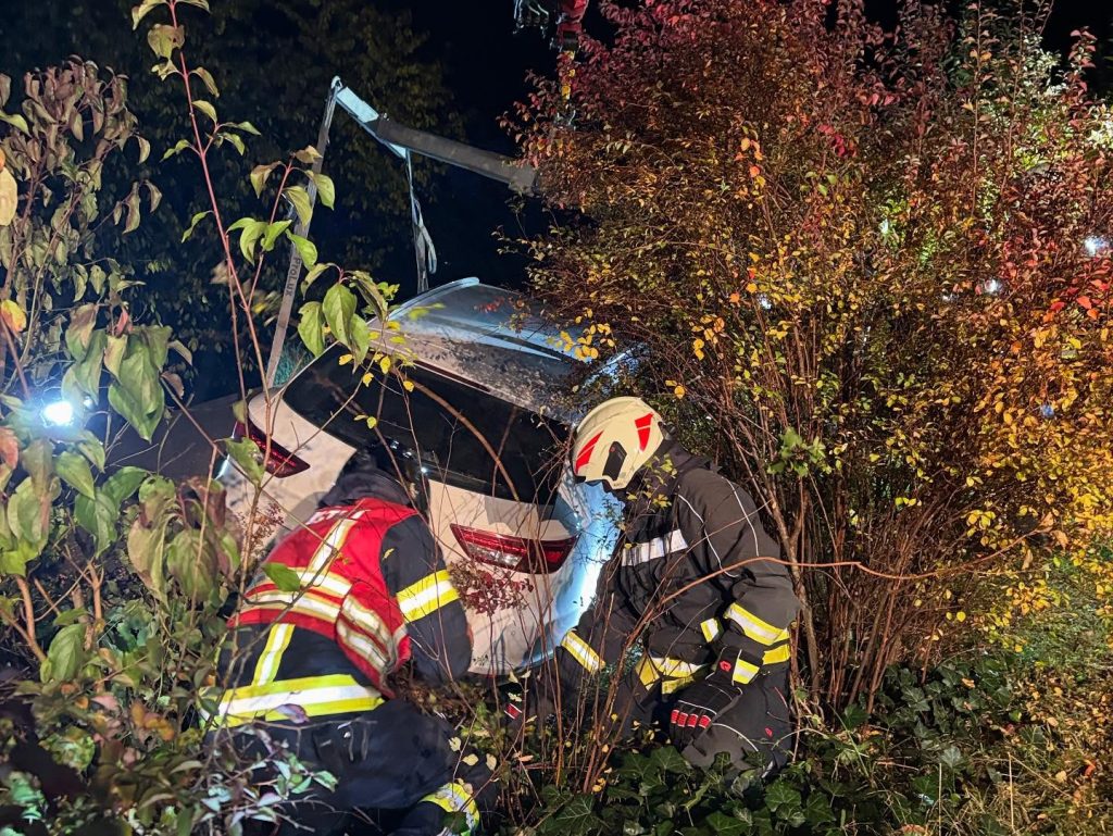 Die Feuerwehrleute aus Kefermarkt haben gemeinsam mit der FF Freistadt das Auto mit einem Kran von der Gartenhütte gehoben. Das Fahrzeug hat ein paar Kratzer abbekommen, die Gartenhütte ist unbeschädigt geblieben.