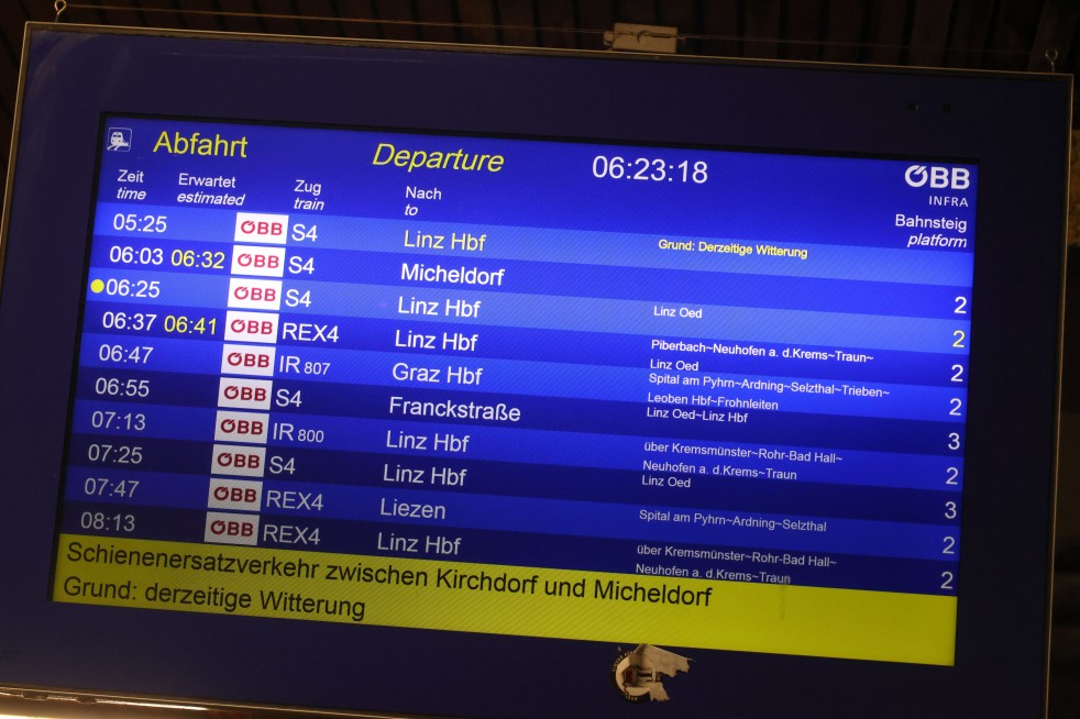 In den frühen Morgenstunden musste ein Zug auf der Pyhrnbahnstrecke evakuiert werden. Aufgrund des Eisregens war zwischen den Bahnhöfen Kirchdorf an der Krems und Micheldorf Endstation – der Zug konnte nicht mehr weiter. Hannes Niedermayr vom Landesfeuerwehrkommando: