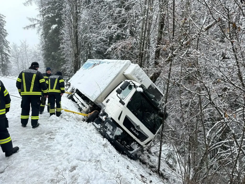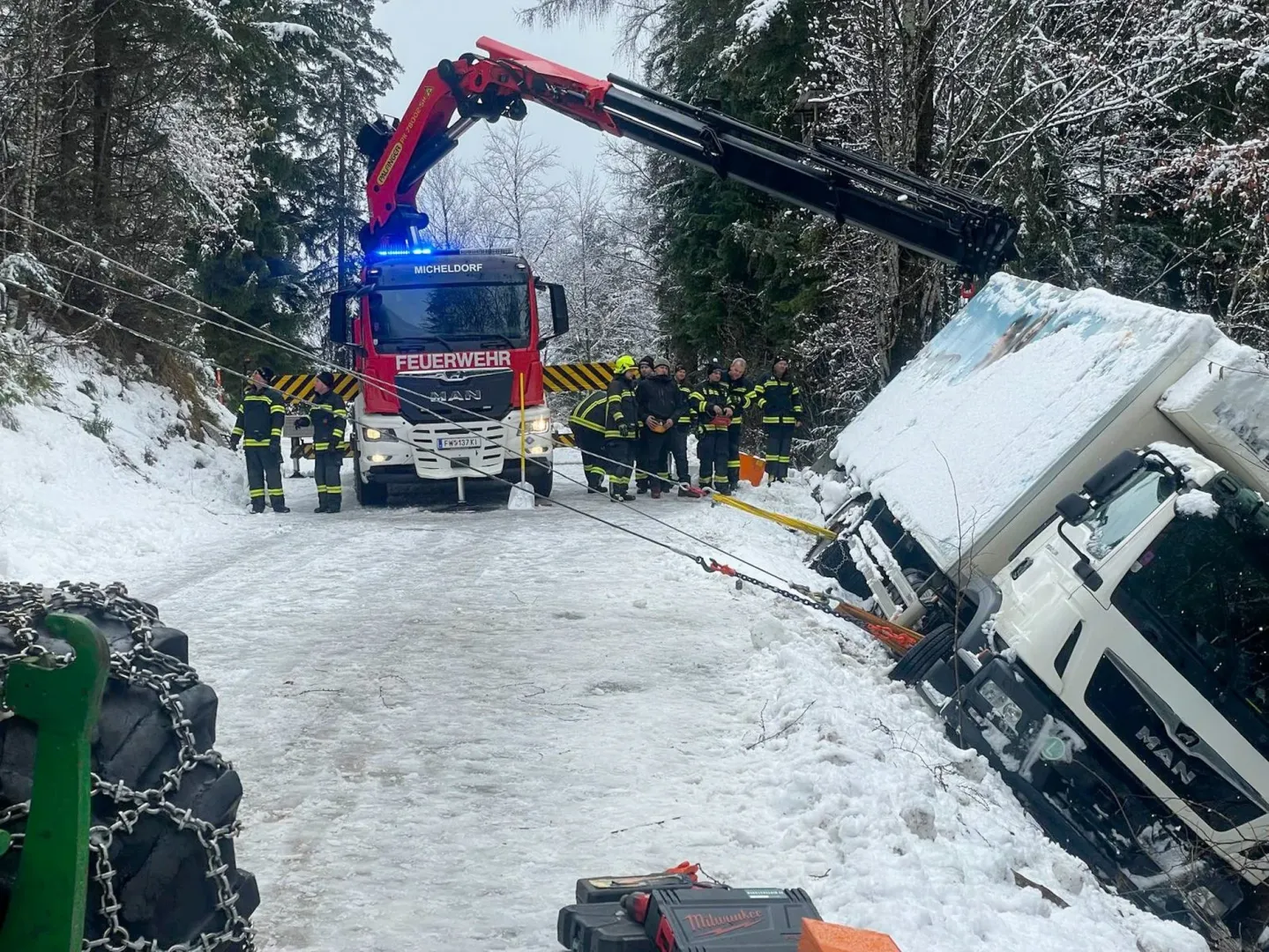Stundenlang war die Feuerwehr in Hinterstoder heute bei einer LKW Bergung im Einsatz. Auf der Höss Mautstraße ist dort ein Lastwagen ins Rutschen gekommen und in die Böschung gekippt. Nur die angrenzenden Bäume haben ein komplettes Abstürzen verhindert. Der Lenker ist unverletzt geblieben, weil auch der LKW kaum beschädigt war hat er seine Fahrt einfach fortgesetzt.