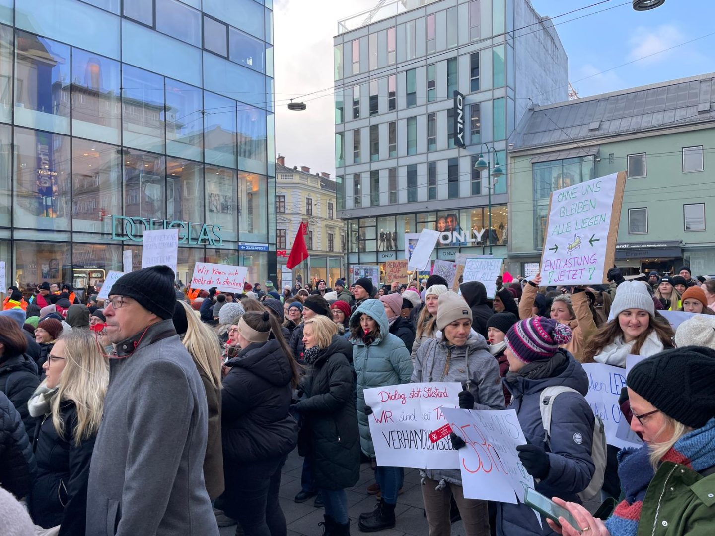 „Viele von Ihnen sind jetzt schon hier hinter mir versammelt, vor dem Krankenhaus der Barmherzigen Schwestern in Linz. Die Stimmung, die ist aufgeheizt. Auch Polizeibeamte sind vor Ort. Gestreikt wird vom nicht ärztlichen Personal. Viele Eingriffe müssen heute abgesagt werden. Die Patienten wurden schon informiert, aber die Streiks, die sind notwendig, sagt das Personal.“