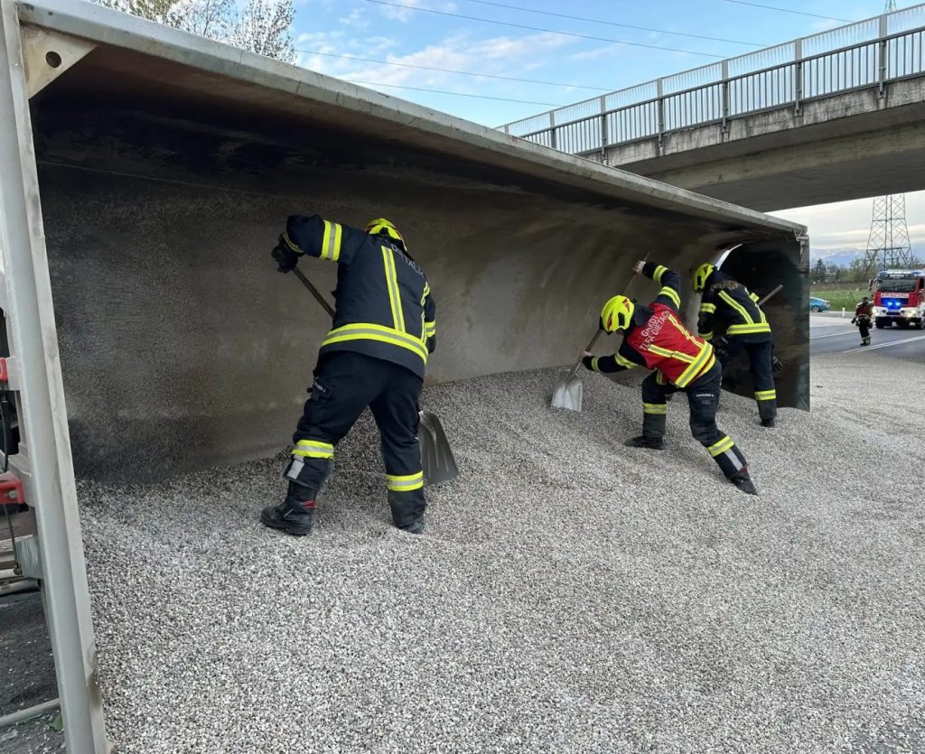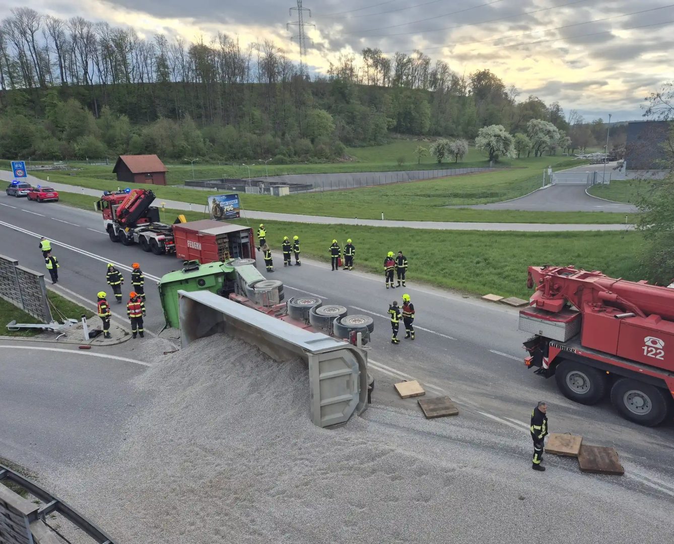 Auf der Steyrer Bundesstraße ist in der Früh bei Dietach ein Lkw im Bereich am Heuberg umgekippt. Eine ganze Ladung Schotter hat sich auf der Fahrbahn verteilt. Feuerwehrleute sind seither beim Schaufeln, dann muss der Lkw wieder aufgestellt werden.
