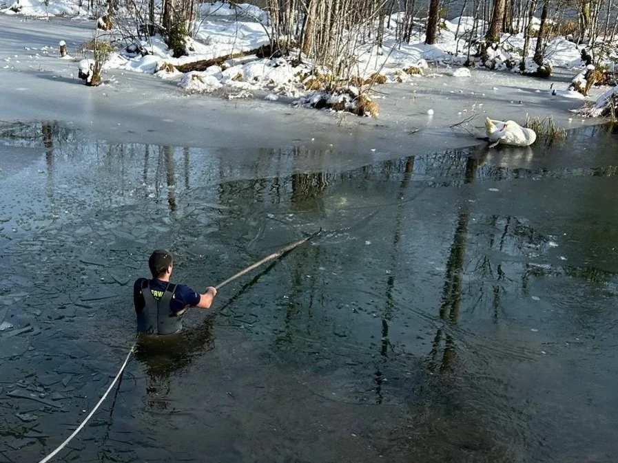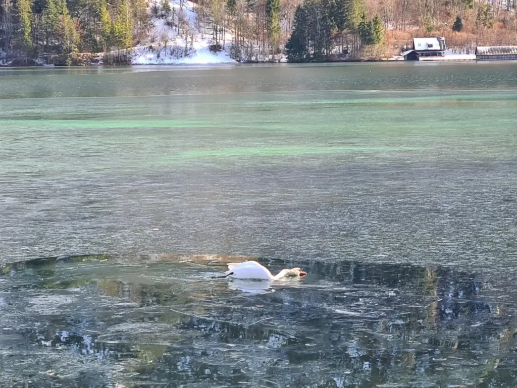 Die Feuerwehr in Grünau im Almtal hat einen Schwan aus dem zugefrorenen Almsee gerettet. Das Tier war auf einer Halbinsel im Wasser gefangen. Es war zwar nicht festgefroren, hat auf der Eisschicht aber nicht wegkönnen.