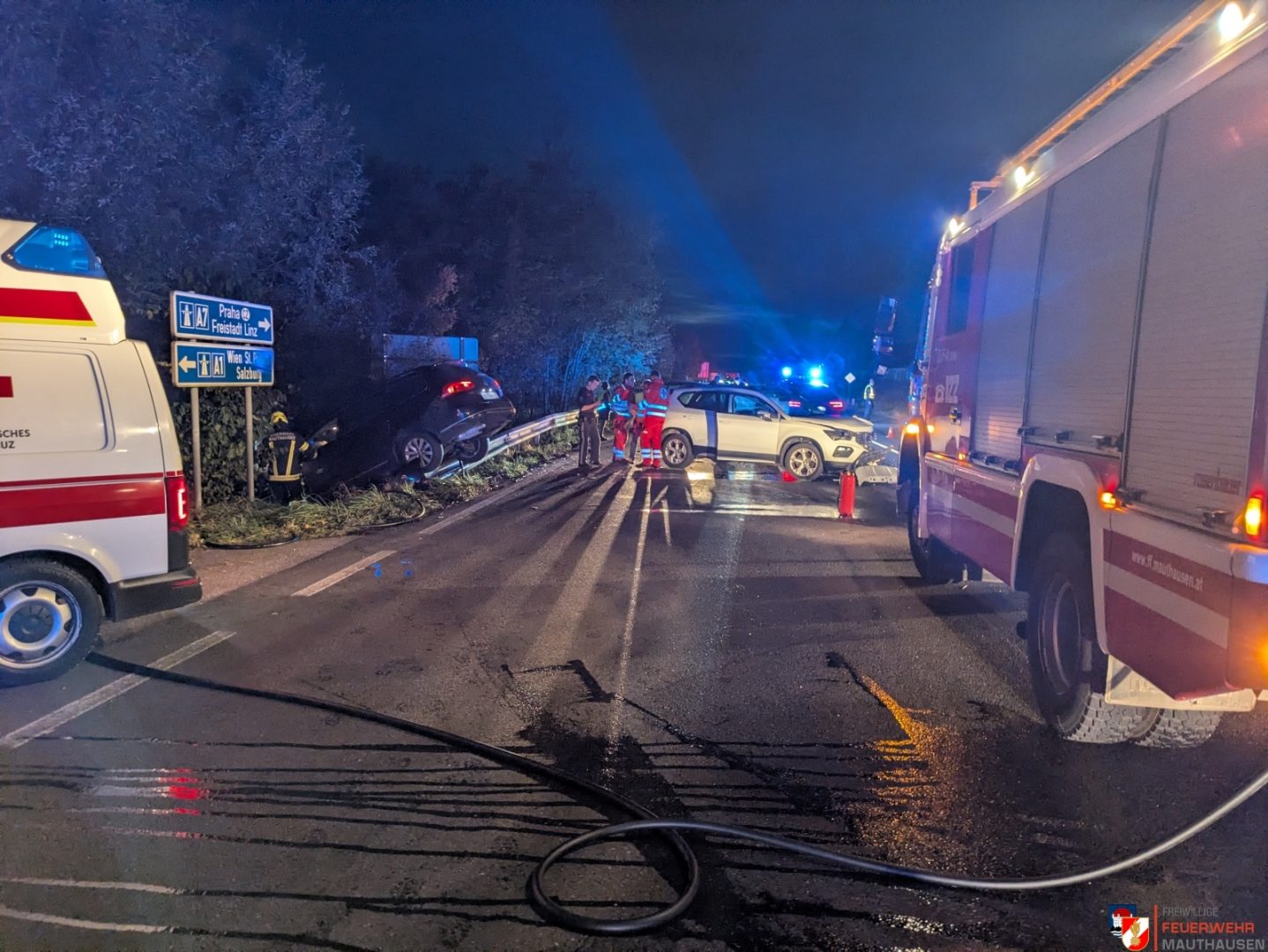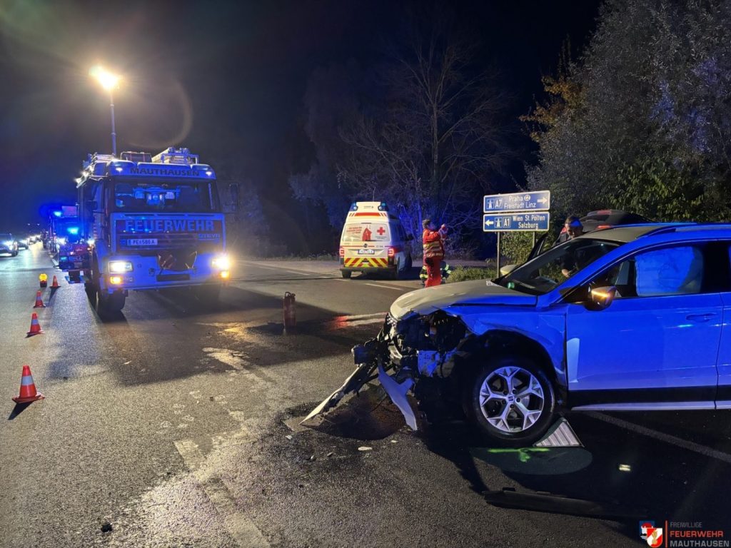 Vier Menschen sind am Abend bei einem Verkehrsunfall in Mauthausen verletzt worden. Bei einer Kreuzung sind zwei Autos zusammengekracht. Eines der Fahrzeuge ist durch nach dem Zusammenstoß noch durch die Leitplanke gerutscht und dort hängen geblieben. Beide Lenker und die Beifahrer wurden ins Kepler Uniklinikum und ins UKH nach Linz gebracht.